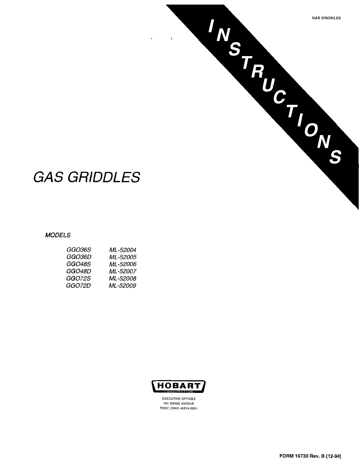Installation, Operation, and Care of & GAS GRIDDLES Yo SAVE THESE INSTRUCTIONS FOR FUTURE USE GENERAL The Models GGO36S, GGO48S and GGO72S Standard Gas Griddles have a standing pilot light and snap action electromagnetically thermostats which allow fast response to load conditions, The Models GGO36D, GGO48D and GGO72D Deluxe Gas Griddles feature solid state temperature controls and an electric pilot ignition. The gas griddle is furnished with a set of four 4" legs with adjustable feet.