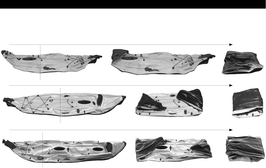 get the kayak into the roller bag, place the open bag underneath the kayak prior to folding. The dotted line in the top pictures