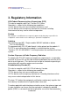 3. Regulatory Information USA-Federal Communications Commission (FCC) This device complies with Part 15 of the FCC Rules. Operation is subject to the following two conditions: (1) This device may not cause harmful interference, and (2) This device must accept any interference received, including interference that may cause undesired operation. Caution Any changes or modifications not expressly approved by the party responsible for compliance could void the user’s authority to operate the equipment.