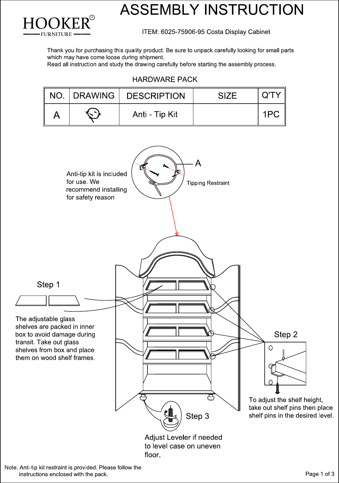 HOOKER’ ASSEMBLY INSTRUCTION FURNITURE —— ITEM: 6025-75906-95 Coats Display Cabinet Thank you for purchasing this quality product. Be sure ta unpack carefully looking for small parts which may have come loose during shipment. Read all instruction and study the drawing carefully before starting the assembly process. HARDWARE PACK NO. | DRAWING | DESCRIPTION SIZE QTY A \S Anti Tip Kit 1PC Anti-tip kit is included for use.