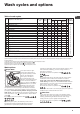 Wash cycles and options Table of wash cycles Icon Description of the wash cycle Detergent and additives Max. Max. Max. temp. Cycle speed Drying PreFabric load duration (°C) Wash Bleach (rpm) (kg) wash softener 40° 1600 - 10 Synthetics Resistant 60° 800 - 5 Synthetics Resistant (4) 40° 800 - 5 Whites 60° 1600 - - - 6 Coloureds (3) 40° 1600 - 6 Darks 30° 800 - - - 6 Wool Platinum Care: for wool, cashmere, etc.