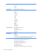 Table 6-3 Computer Setup—Security (continued) Device Security USB Security Allows you to set Device Available/Device Hidden (default is Device Available) for: ● Embedded security device ● System audio ● Network controller ● Serial port (if applicable) ● Parallel port (if applicable) ● SATA ports (varies by model) Allows you to set Enabled/Disabled (default is Enabled) for: ● Front USB Ports ● Rear USB Ports ● Accessory USB Ports Slot Security Allows you to disable any PCI or PCI Express