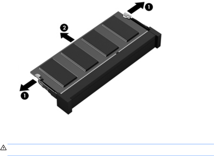 b. Segure as extremidades do módulo de memória (2) e puxe-o cuidadosamente para fora da