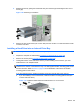 4. Release the drive by pulling the release tab away from the drive (1) and sliding the drive out of