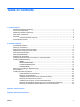 Table of contents 1 Product Features Standard Configuration Features ......................................................................................................... 1 Front Panel Components ..................................................................................................................... 2 Media Card Reader Components ......................................................................................................... 3 Rear Panel Components ................................