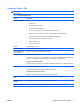 Computer Setup—Advanced NOTE: Support for specific Computer Setup options may vary depending on the hardware configuration. Table 6 Computer Setup—Advanced (for advanced users) Option Heading Power-On Options Allows you to set: ● POST mode (QuickBoot, FullBoot, or FullBoot every 1–30 days). ● POST messages (enable/disable). ● F9 prompt (enable/disable or hidden/displayed). Enabling this feature will display the text F9 = Boot Menu during POST.