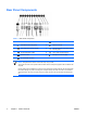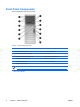 Keyboard Table 1-4 Keyboard Components 1 ENWW 1 Function Keys Perform special functions depending on the software application being used. 2 Editing Keys Includes the following: Insert, Home, Page Up, Delete, End, and Page Down. 3 Status Lights Indicate the status of the computer and keyboard settings (Num Lock, Caps Lock, and Scroll Lock). 4 Numeric Keys Work like a calculator keypad. 5 Arrow Keys Used to navigate through a document or Web site.