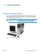 1 Product Features Standard Configuration Features The HP Compaq Convertible Minitower features may vary depending on the model. For a complete listing of the hardware and software installed in the computer, run the diagnostic utility (included on some computer models only). Instructions for using the utility are provided in the Troubleshooting Guide on the Documentation and Diagnostics CD. NOTE The HP Compaq Convertible Minitower computer can be easily converted to a desktop.