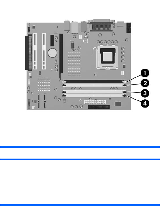 There are four DIMM sockets on the system board, with two sockets per channel. The sockets are