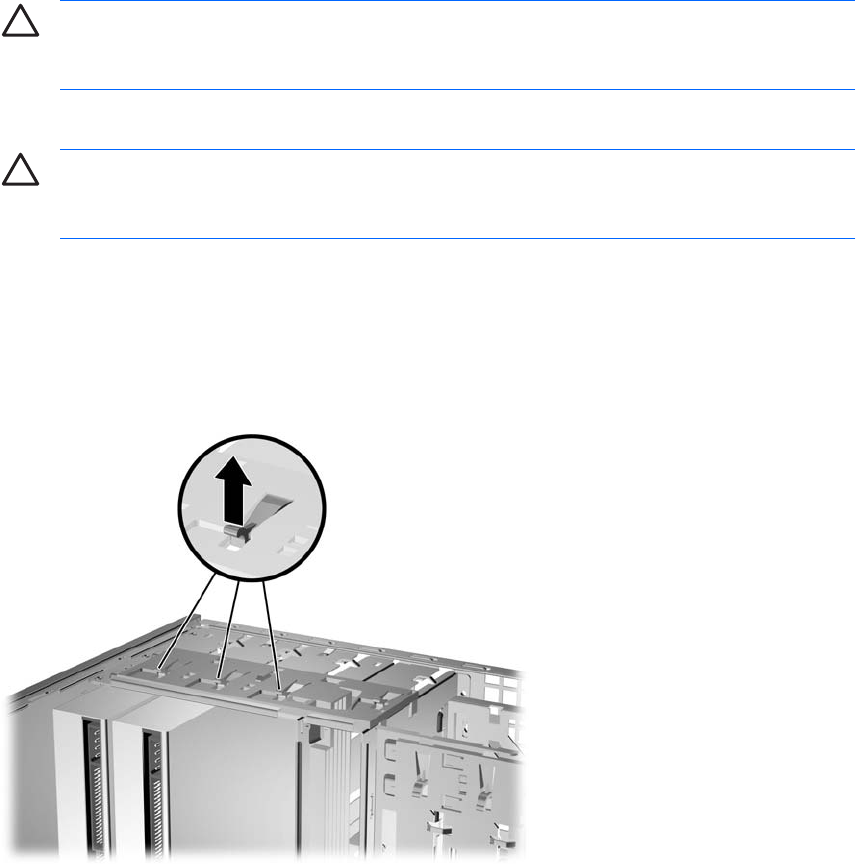 8. To release the drives from the 5.25-inch drive bay, lift the release tab on the green latch drive