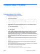 Table 4 Computer Setup—Security (continued) See the Desktop Management Guide for more information. Smart Cover (some models) Allows you to: ● Lock/unlock the Cover Lock. ● Set the Cover Removal Sensor to Disable/Notify User/Setup Password. NOTE: Notify User alerts the user that the sensor has detected that the cover has been removed. Setup Password requires that the setup password be entered to boot the computer if the sensor detects that the cover has been removed.