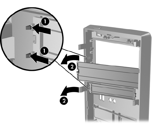 2. Press the two retaining tabs towards the outer left edge of the bezel (1) and pull the bezel blank