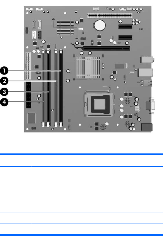 There are four DIMM sockets on the system board, with two sockets per channel. The sockets are