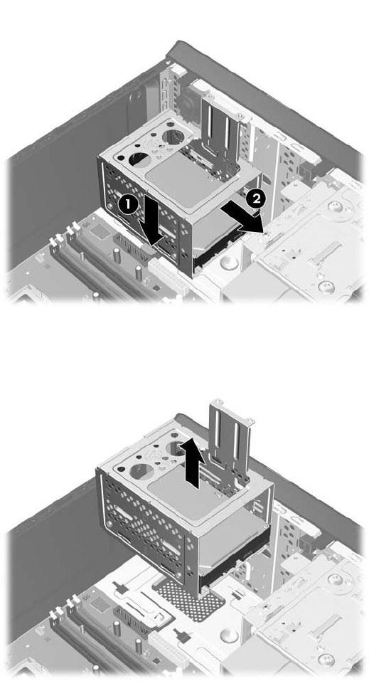 7. Push down the latch on the side of the hard disk drive cage (1), then slide the hard disk drive cage