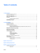 Table of contents 1 Product Features Standard Configuration Features ......................................................................................................... 1 Front Panel Components ..................................................................................................................... 2 Media Card Reader Components ......................................................................................................... 3 Rear Panel Components ................................