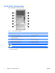Keyboard Table 1-4 Keyboard Components 1 ENWW 1 Function Keys Perform special functions depending on the software application being used. 2 Editing Keys Includes the following: Insert, Home, Page Up, Delete, End, and Page Down. 3 Status Lights Indicate the status of the computer and keyboard settings (Num Lock, Caps Lock, and Scroll Lock). 4 Numeric Keys Work like a calculator keypad. 5 Arrow Keys Used to navigate through a document or Web site.