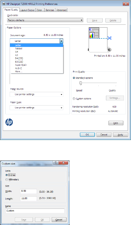 Wenn das gewünschte Format nicht vorhanden ist, wählen Sie Benutzerdefiniert. Geben Sie die Breite