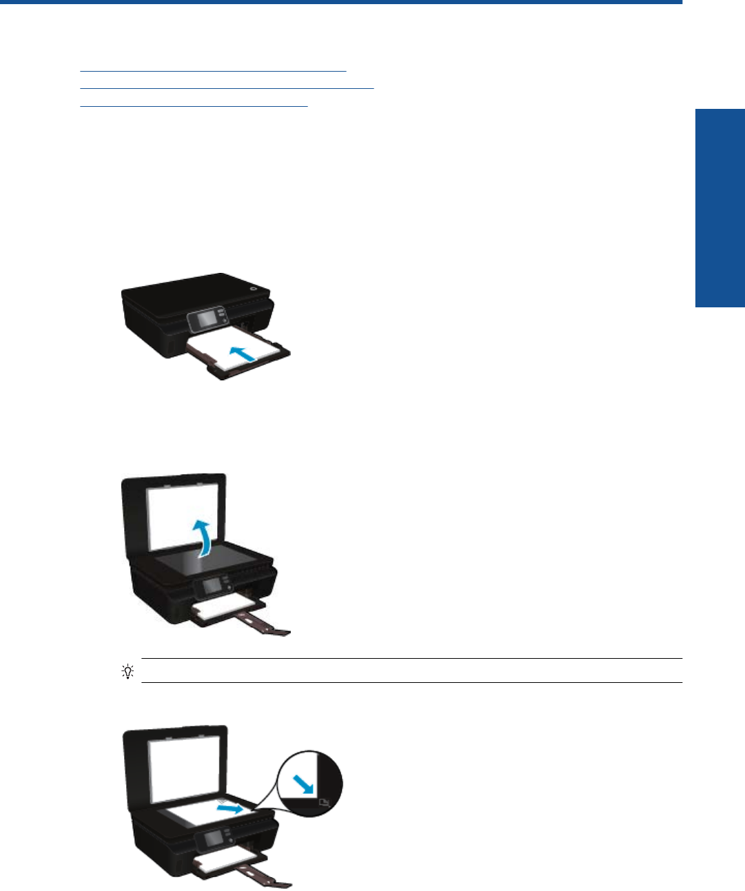 Încărcaţi originalul cu faţa imprimată în jos, în colţul frontal din dreapta al geamului suport.