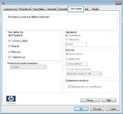Yksityinen työ: Työtä ei tulosteta,ennen kuin pyydät sitä laitteen ohjauspaneelista. Tätä töiden