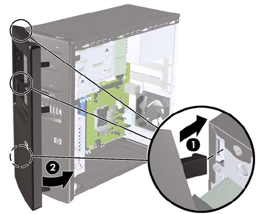 Insert the three hooks on the left side of the bezel into the slots on the chassis (1) and rotate the bezel
