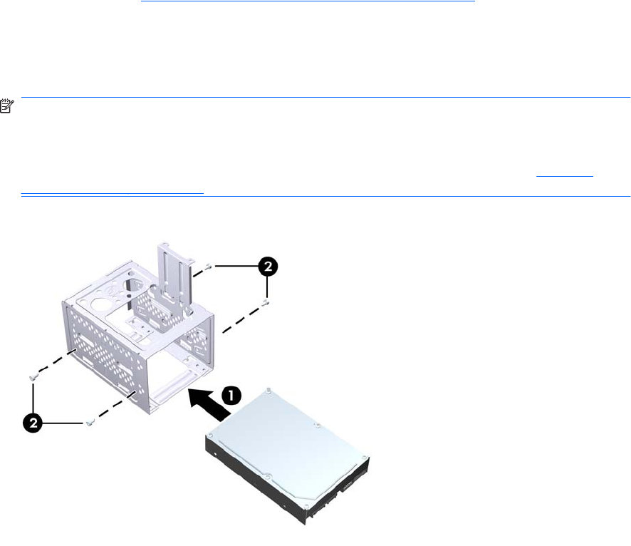 drive cage (2). Make sure the hard disk drive cables are facing the top of the drive cage.