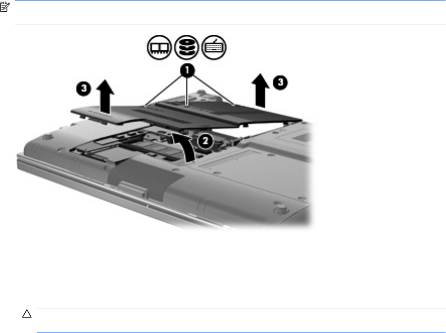 8. Using your finger or a screwdriver, lift the edge of the memory module compartment cover (2) to