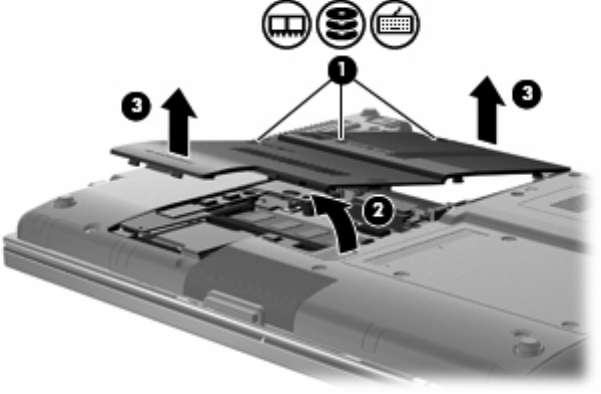 8. Using your finger or a screwdriver, lift the edge of the hard drive cover (2) to release it, and then