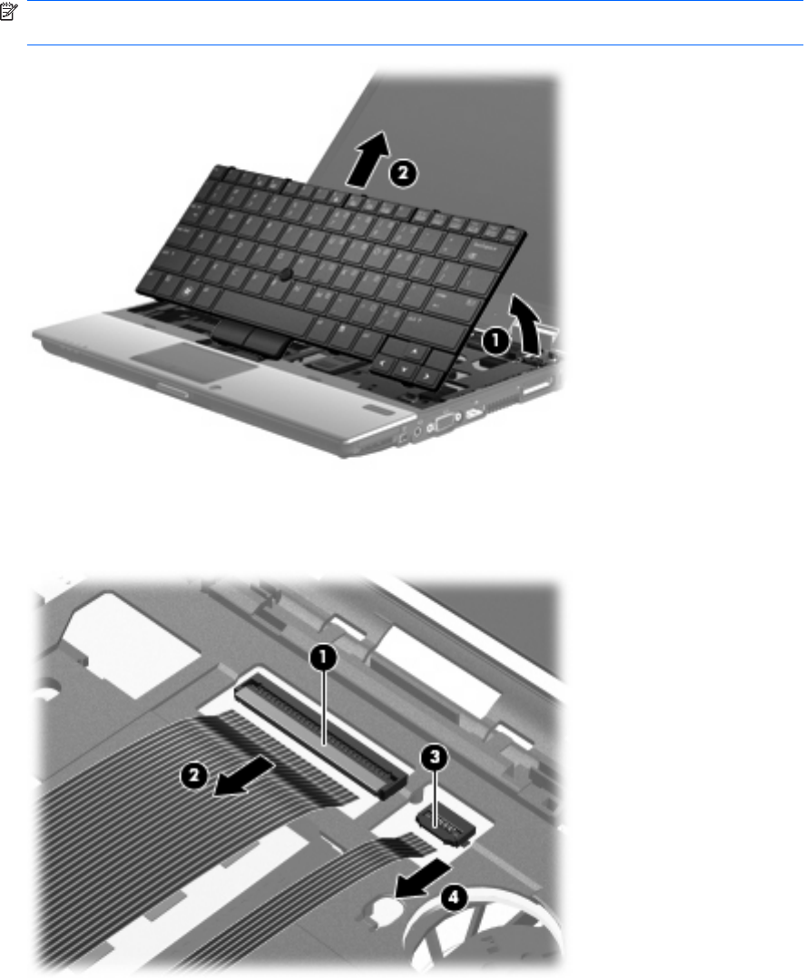 13. Carefully lift the top edge of the keyboard (1), and pull the keyboard up (2).