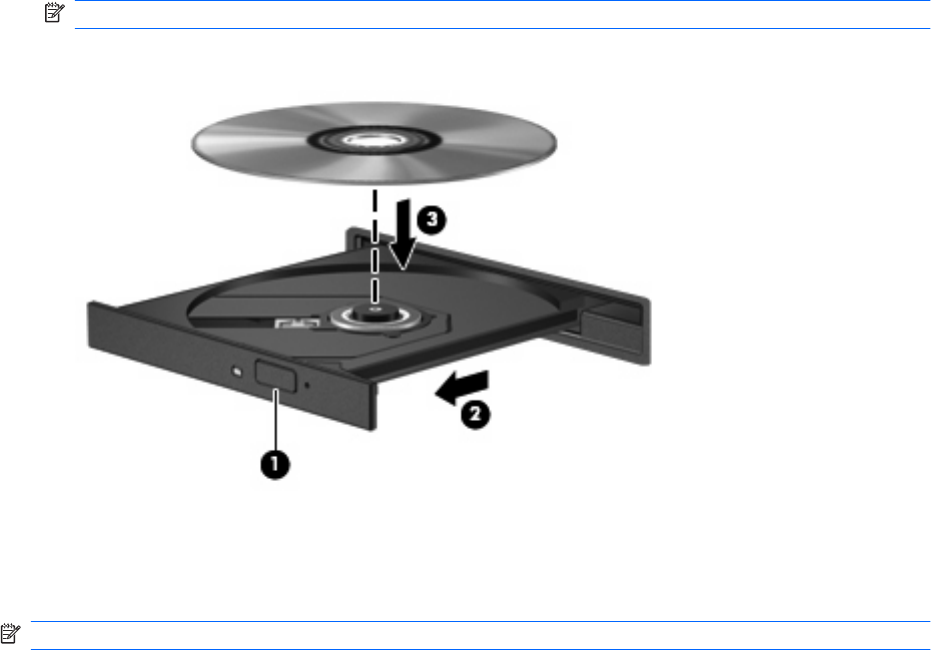 2. Press the release button (1) on the optical drive bezel to release the disc tray.