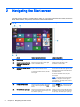 2 Navigating the Start screen The Start screen provides a central location where you can access information and email, browse the Web, stream videos, view photos, and access social media websites. NOTE: Your computer's Start screen may look different than the following illustration. Action Using a keyboard and mouse Using touch gestures (1) Open an app Click a Start screen app. Tap a Start screen app.