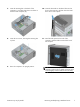 10. Lift the retaining bar at the front of the computer (1), and then remove it from the back of the computer (2). 12. Using a screwdriver, push the lever marked “1” on the base of the right side of the hard drive cage by the motherboard. 11. Remove the three screws that attach the hard disk drive cage to the computer. 13. Grasp the hard drive cage and slide the cage toward the CD/DVD drive (1), and then lift the cage out of the computer (2).