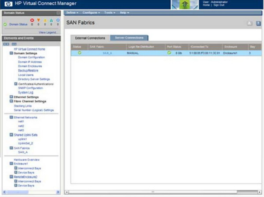 This screen lists all of the SAN fabrics that have been created and displays the server connection