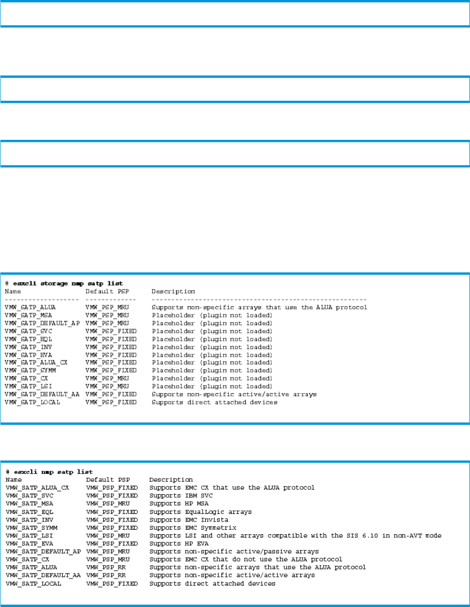 To list default SATP rules and their current default PSP (path policy), issue the following commands: