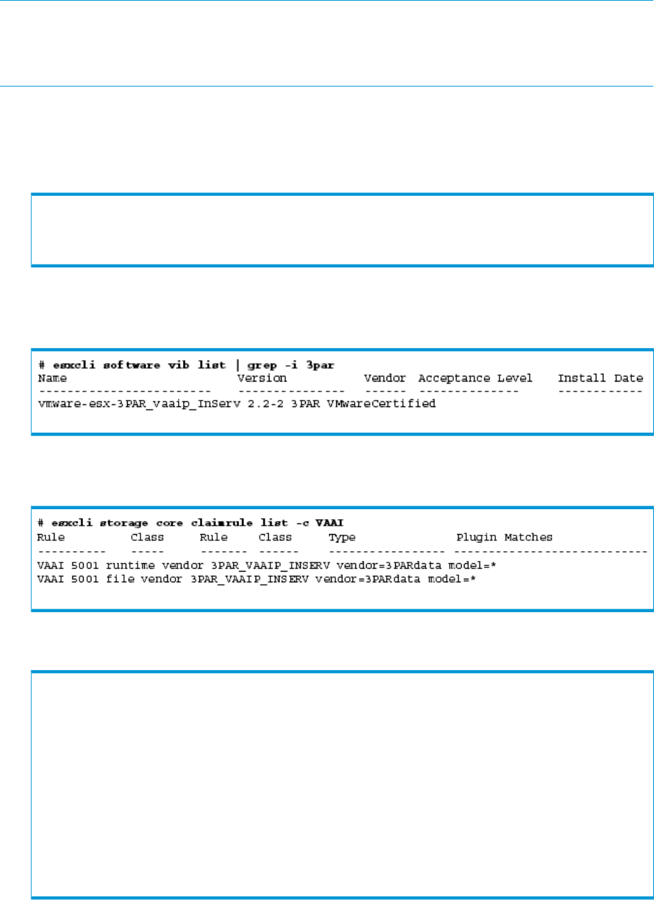 To verify that VAAI 2.2.0 is installed on ESXi 5.x and enabled for HP 3PARdata vendor, use the