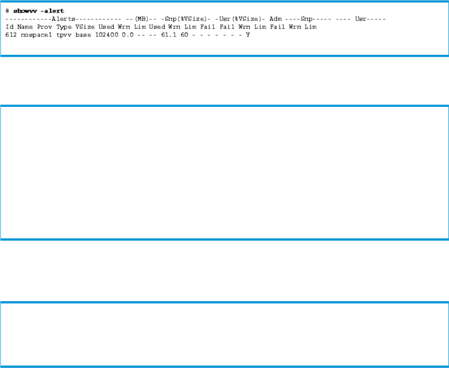 0x27/0x7 is sent. Use showspace, showvv -r, and showalert to see the warning and space