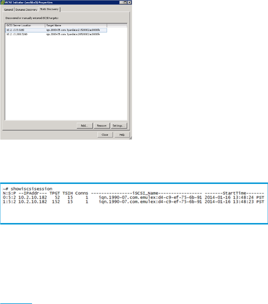 16. Issue the showiscsisession command using the HP 3PAR OS CLI to verify connectivity.