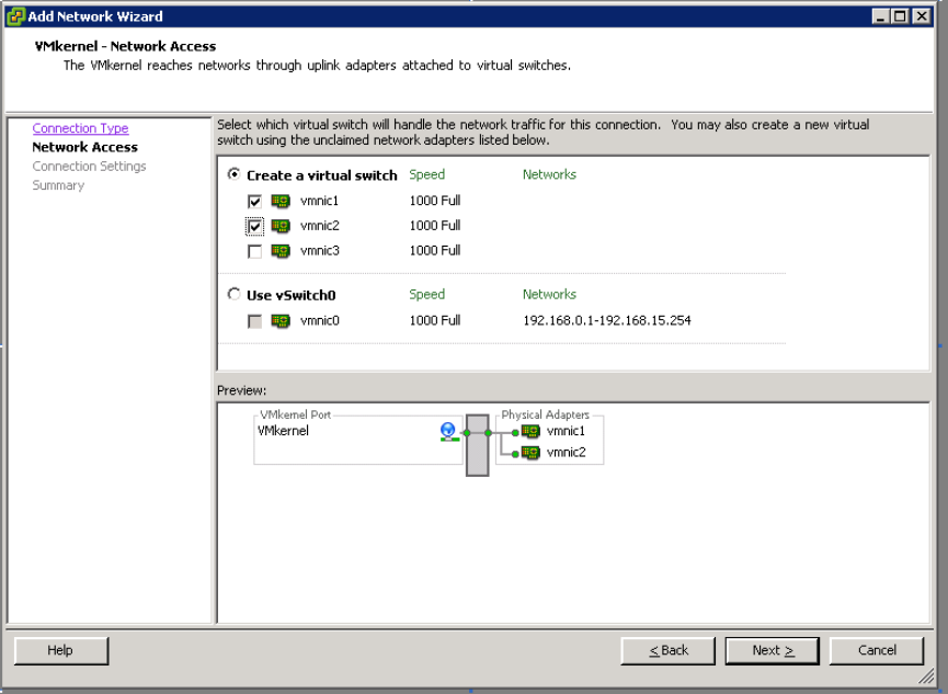 5. Select Create a Virtual Switch and select the NICs that will be used for iSCSI. (In this example,