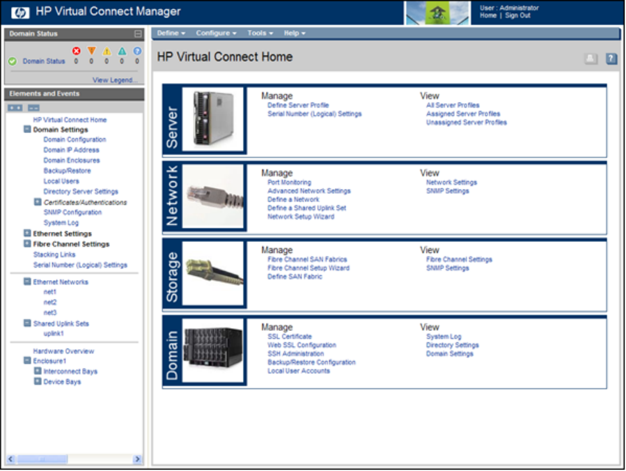 This screen provides access for the management of enclosures, servers, networking, and storage.