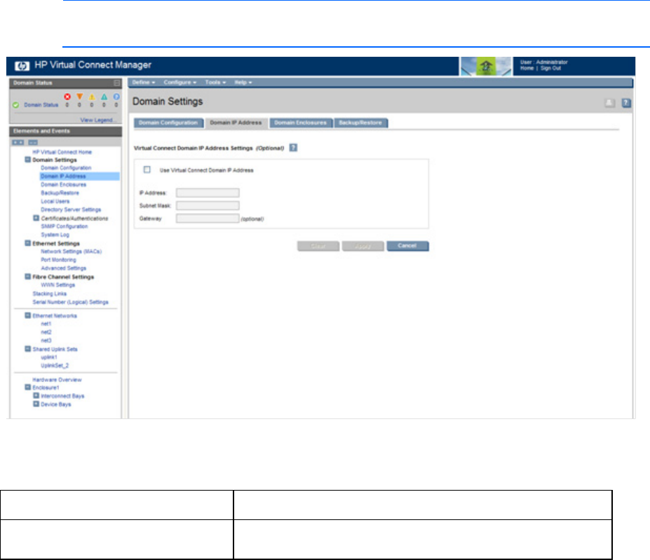 Use this screen to set a domain IP address for the Virtual Connect domain.