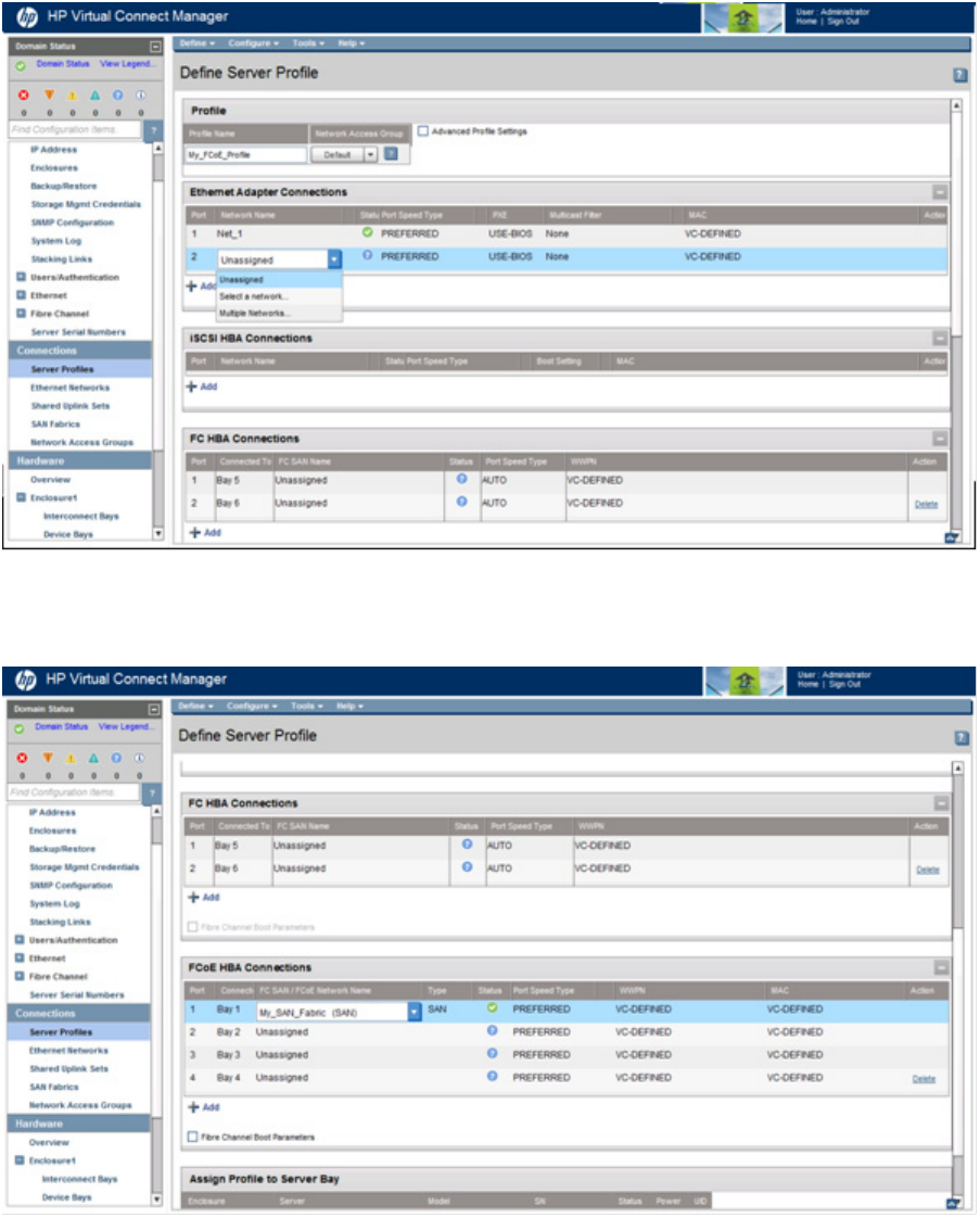- Assigning a server profile with FCoE connections to an HP ProLiant BL680c G7 Server Blade