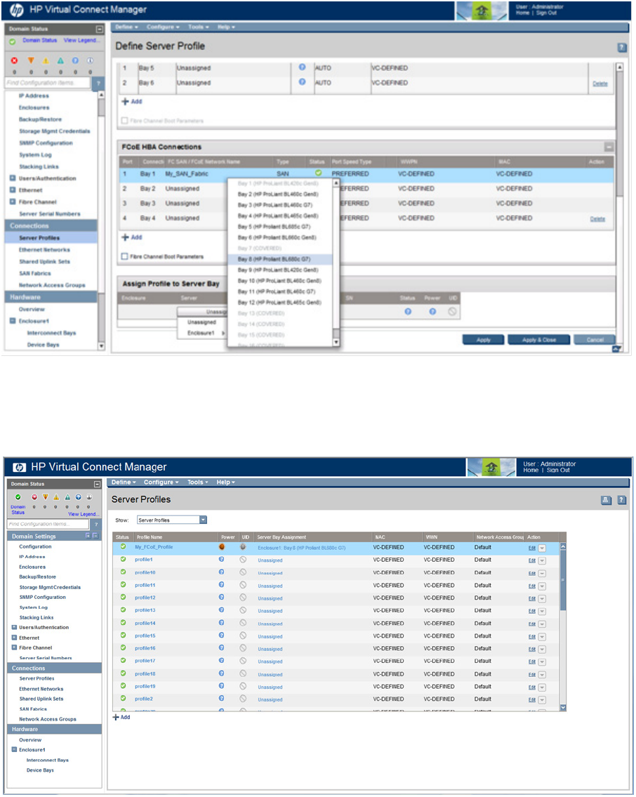 - Assigning a server profile with FCoE connections to an HP ProLiant BL680c G7 Server Blade
