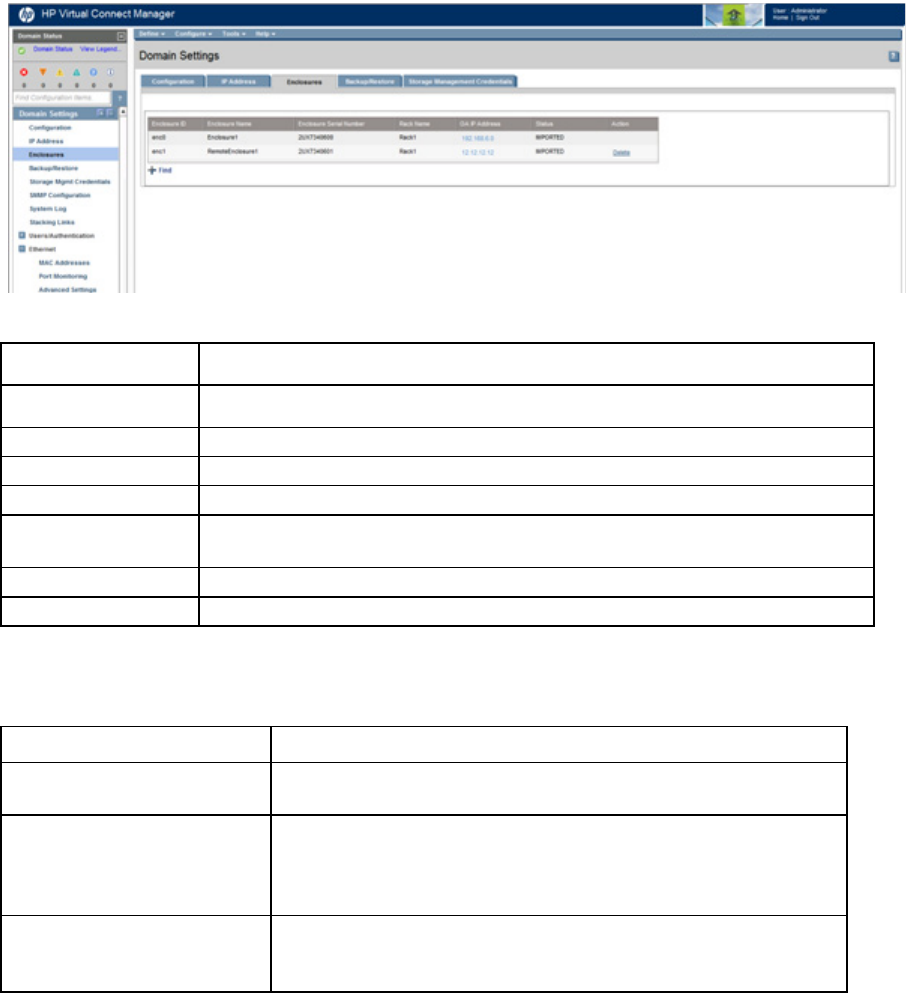 The following table describes the columns within the Domain Settings (Enclosures) screen.