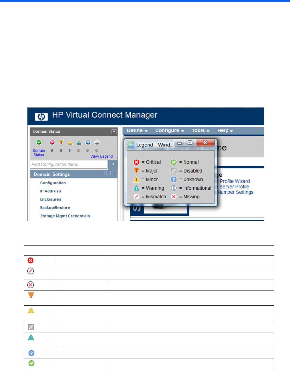 The Domain Status summary provides a count of Virtual Connect elements that are in an alert status other than