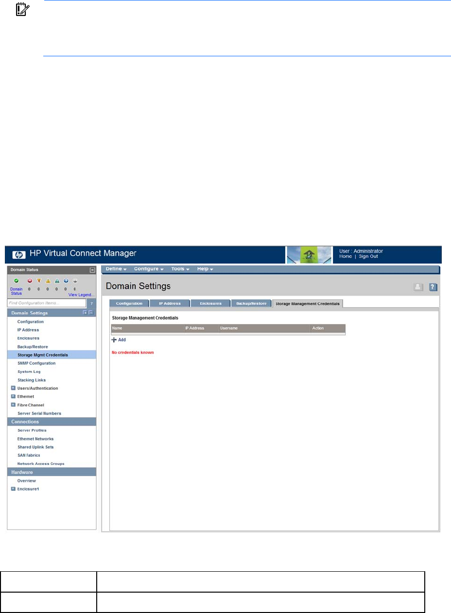 Domain Settings (Storage Management Credentials) screen