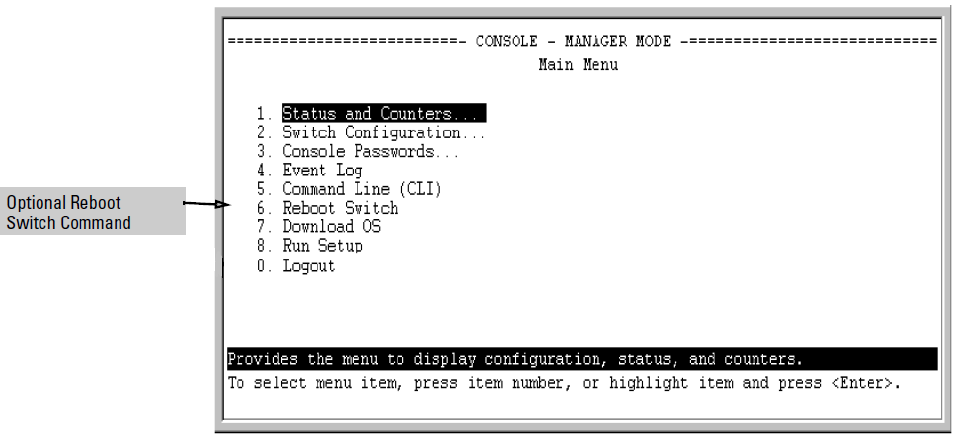 To Reboot the switch, use the Reboot Switch option in the Main Menu. (Note that the Reboot Switch