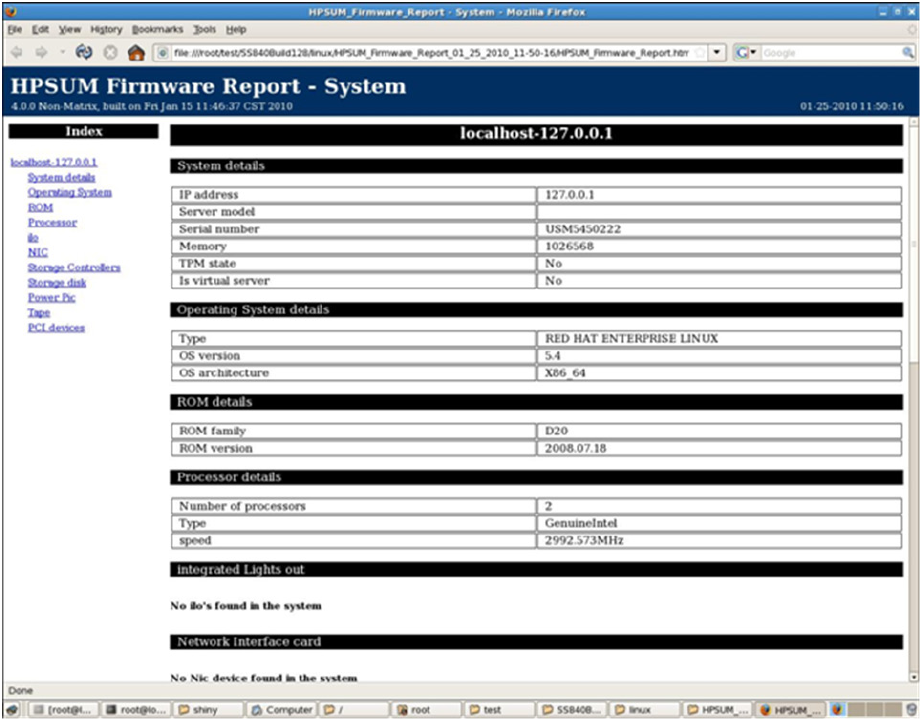 The following figure illustrates the HP SUM Firmware report in HTML format.