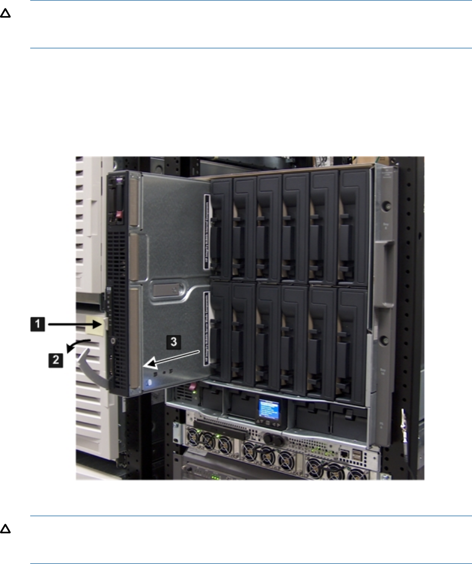 3. Grasp the lever and slide the server blade out of the enclosure (3). Place your hand under the