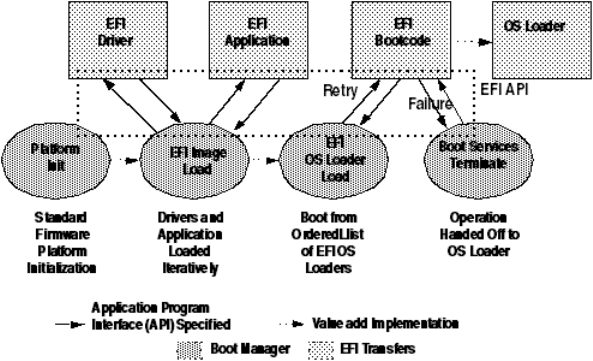 The EFI boot manager loads EFI applications (including the OS first stage loader) and EFI drivers