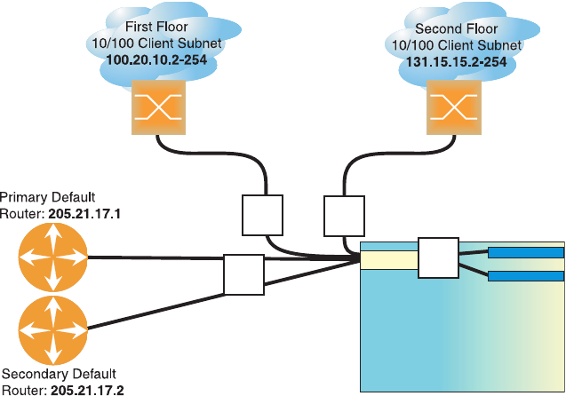 throughout one building. Common servers are placed on another subnet attached to the switch. A