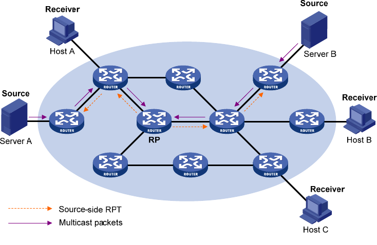 After a bidirectional RPT is built, multicast traffic is forwarded along the source-side RPT and receiver-side